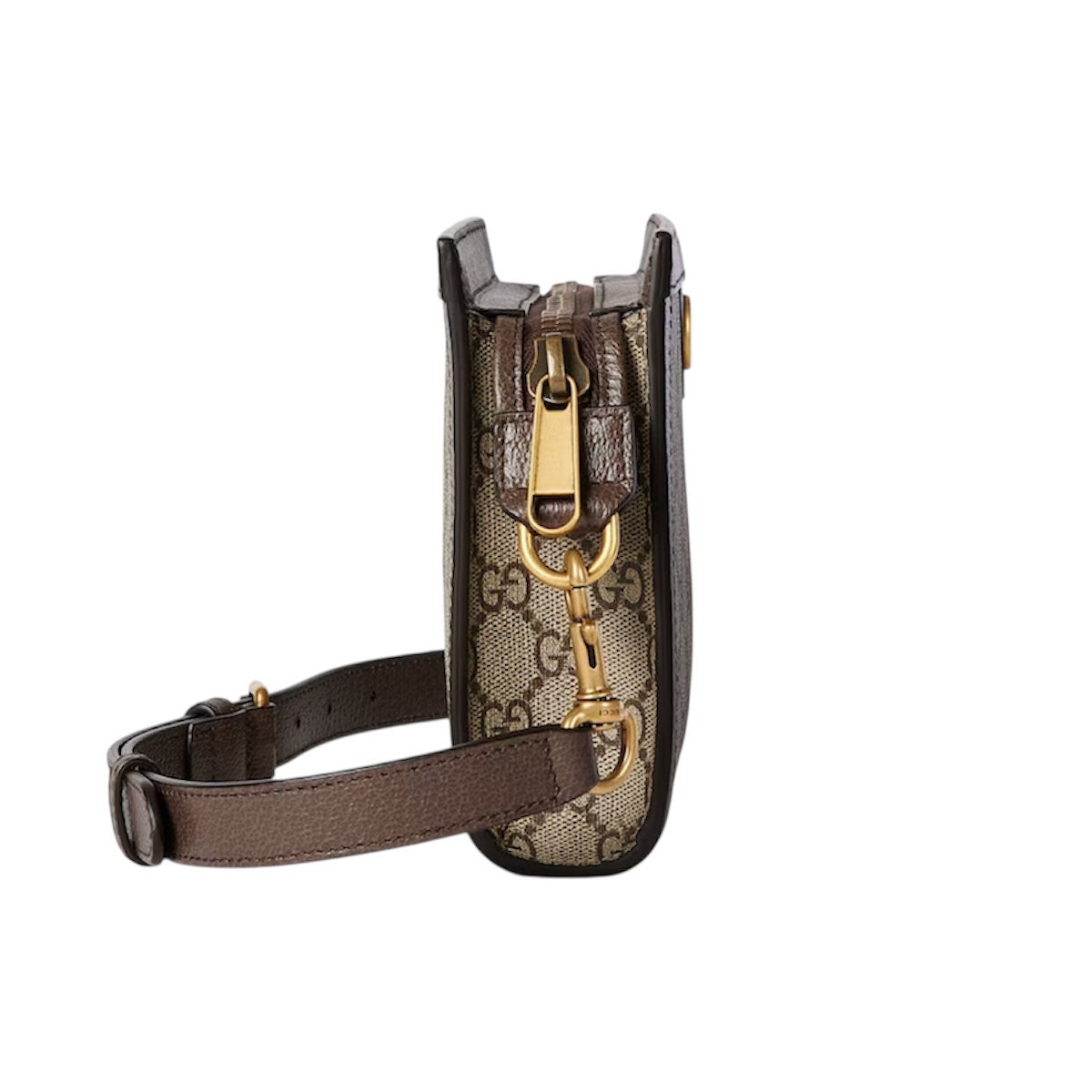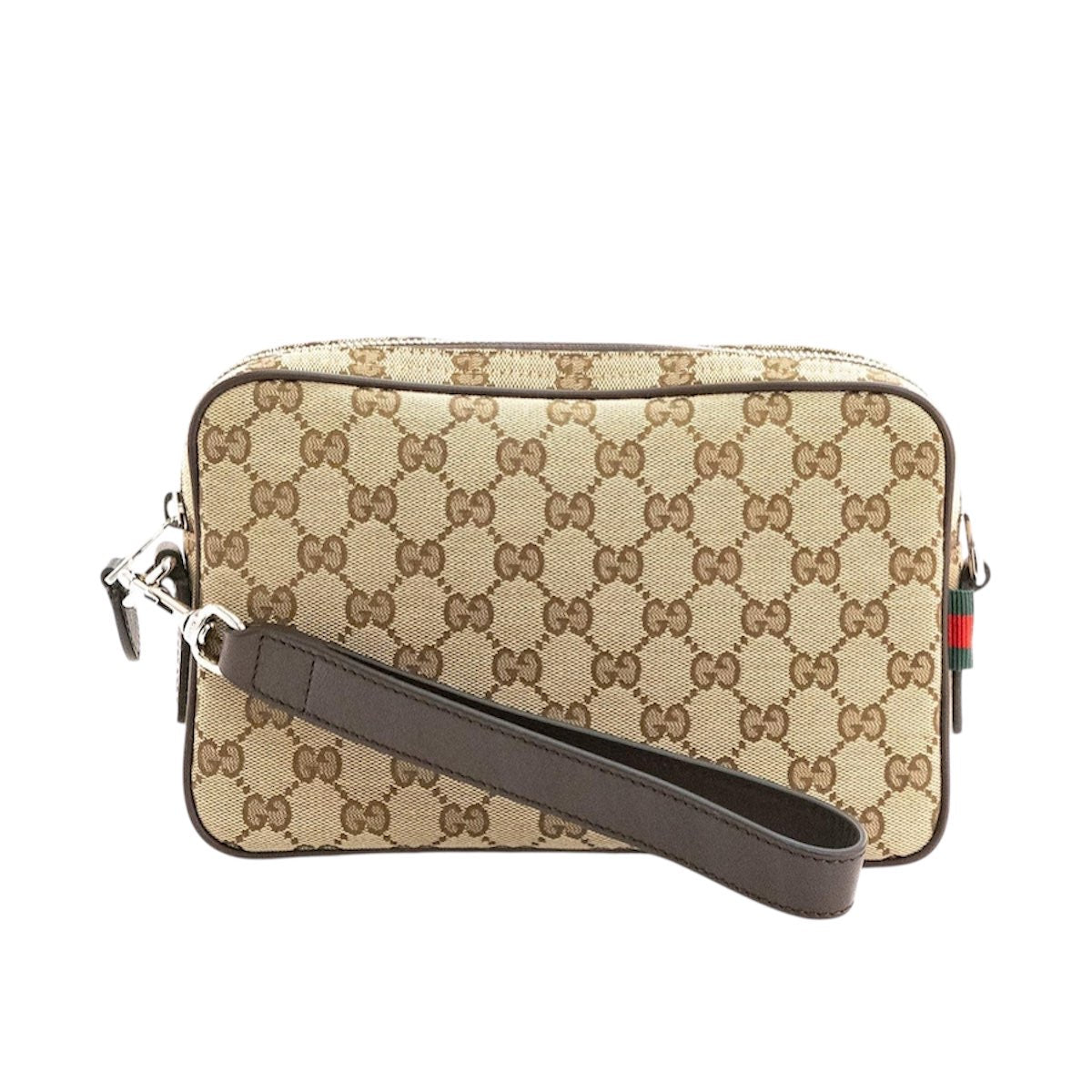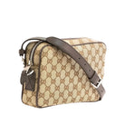 Borsa a spalla in tessuto GG color beige e marrone scuro con finiture in pelle caratterizzata da metalleria color argento, chiusura con zip, laccio da polso removibile e spallaccio regolabile e removibile. L'interno foderato è dotato di tasca piatta.