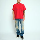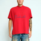 T-Shirt rossa con stampa e scritta blu in ricamo