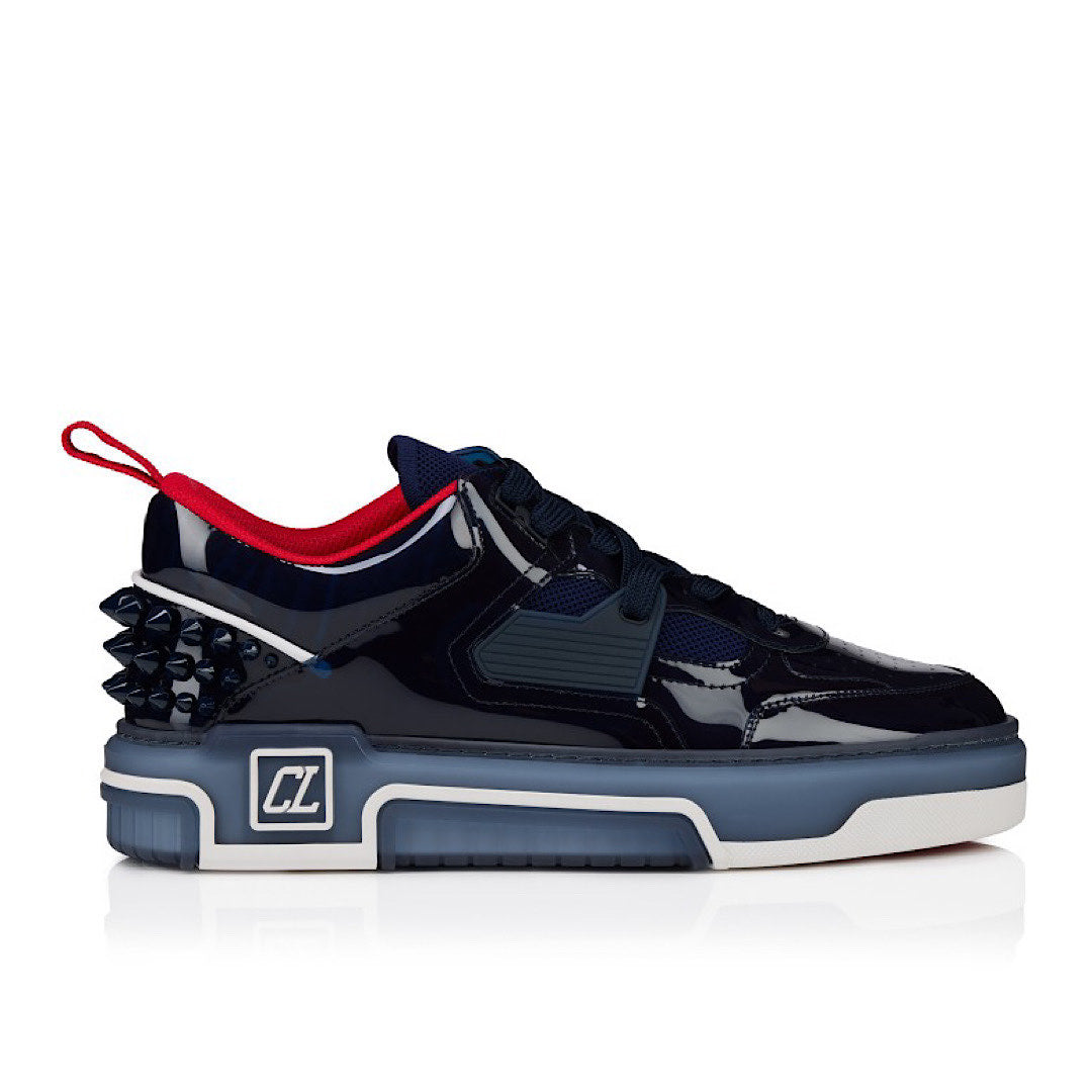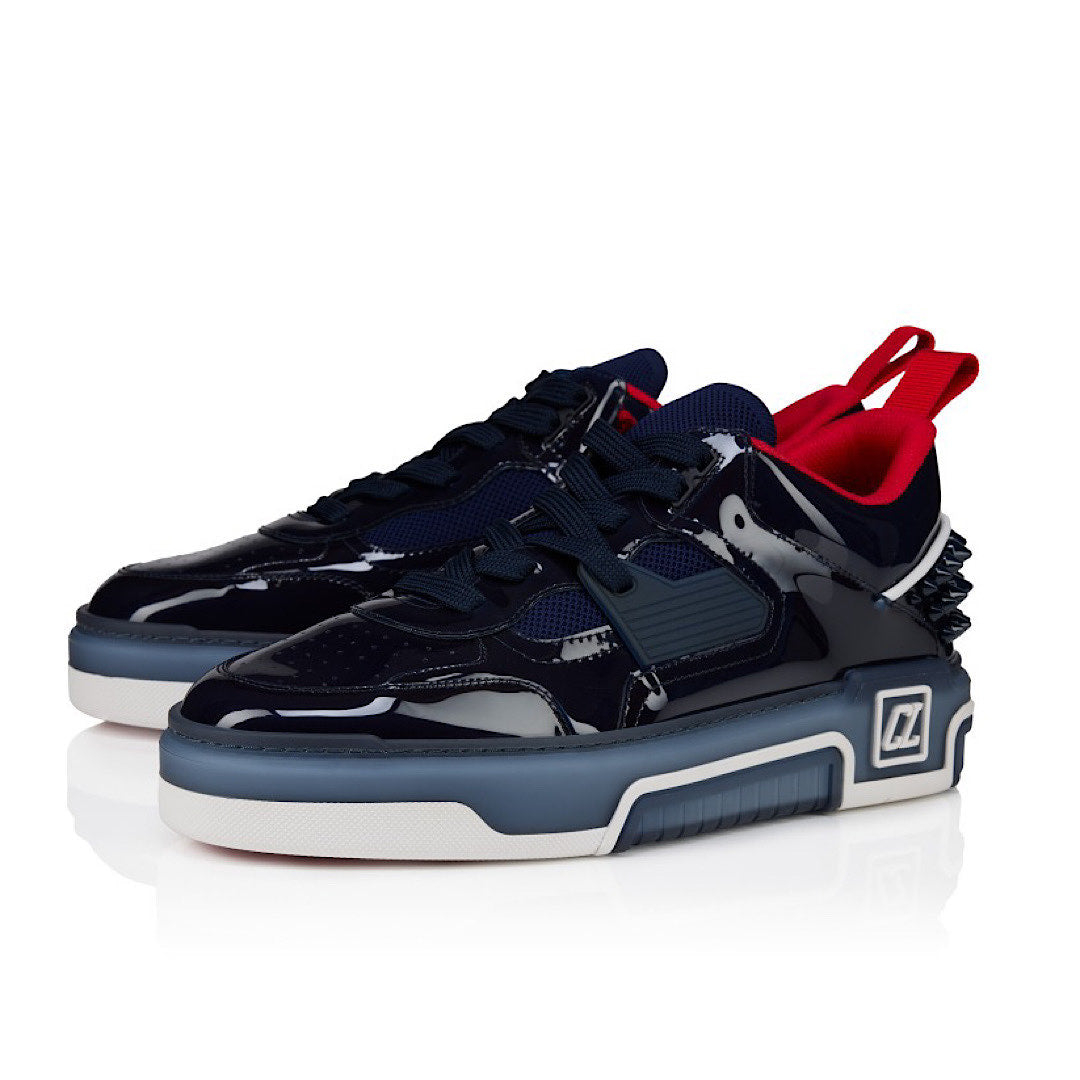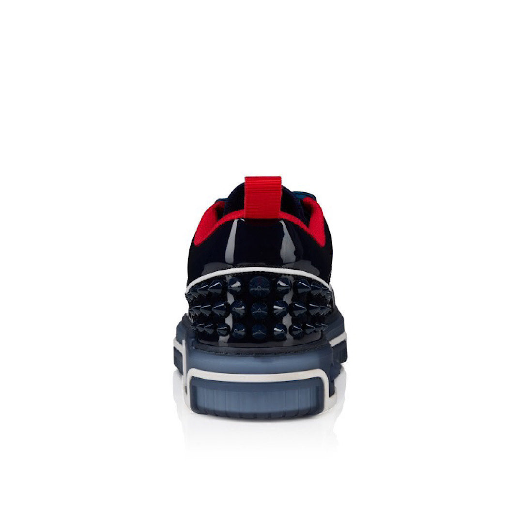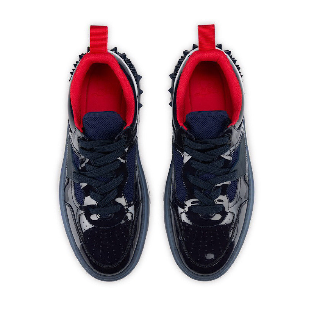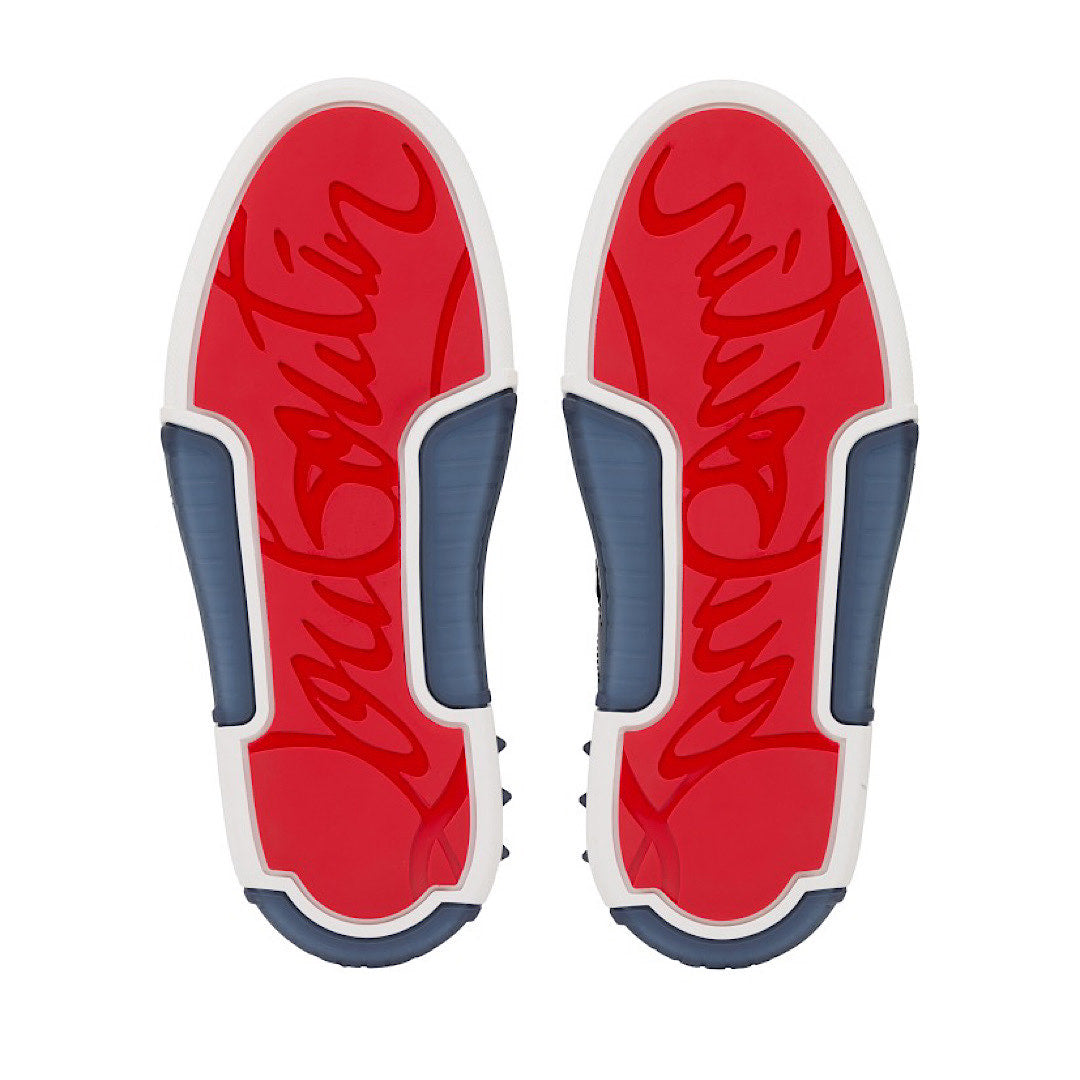 Realizzata in nappa d'agnello e PVC blu notte Zaffiro, questa scarpa sportiva presenta una linguetta sul tallone e le iconiche borchie di Maison Christian Louboutin sul contrafforte. La suola bicolore è rifinita con l'iconico monogramma CL.