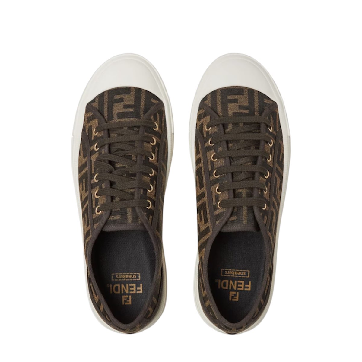 Sneaker Fendi Domino dal design compatto e leggero. Realizzata in tessuto con motivo FF jacquard nei toni del marrone e tabacco. Suola a cassetta in gomma con motivo FF a rilievo sulla punta.
