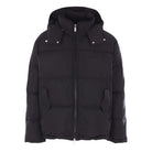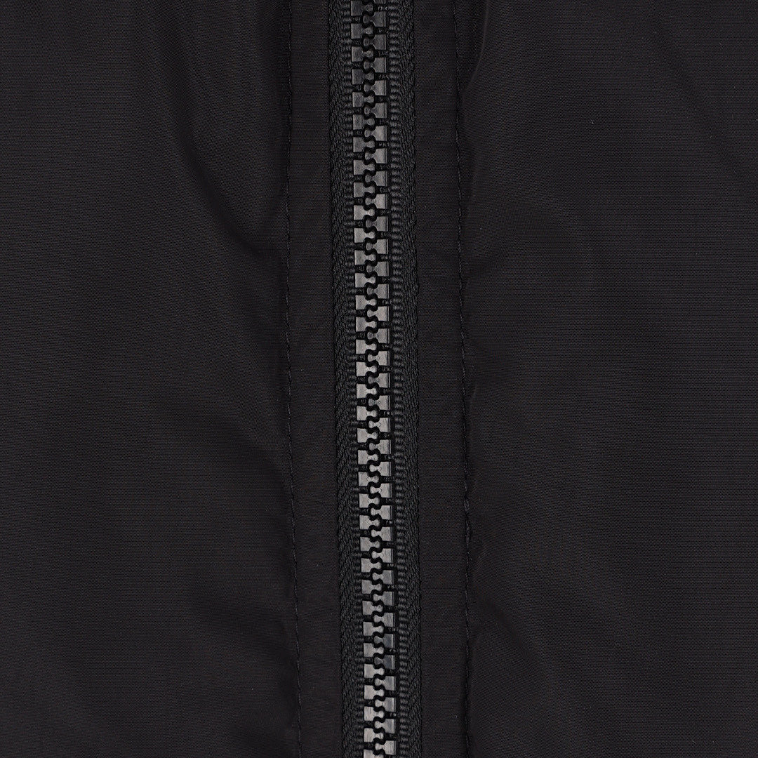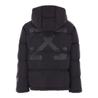 Piumino di Off White realizzato in nylon color nero con ricamo logo sul petto e stampa Diagonal Arrow sulle maniche e sul retro. Caratterizzato da collo alto, cappuccio removibile, chiusura frontale con zip a doppio cursore, tasche con patta, maniche lunghe con polsini elasticizzati e fondo dritto con coulisse.