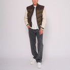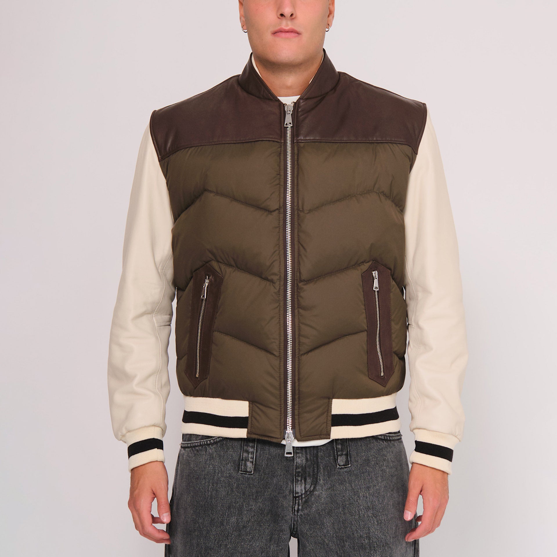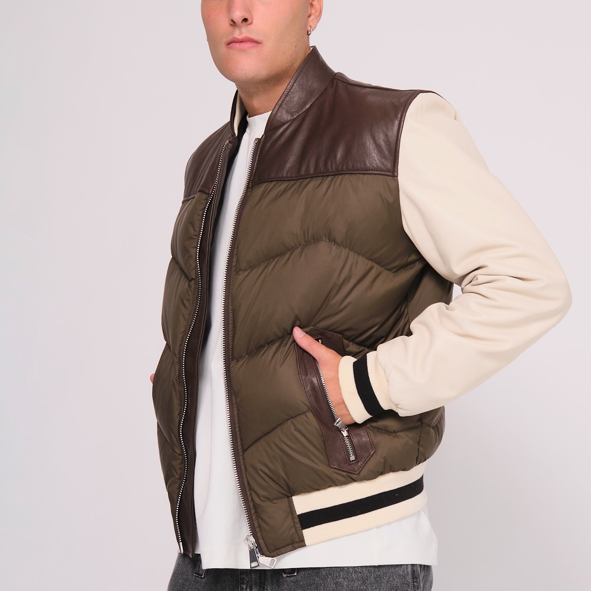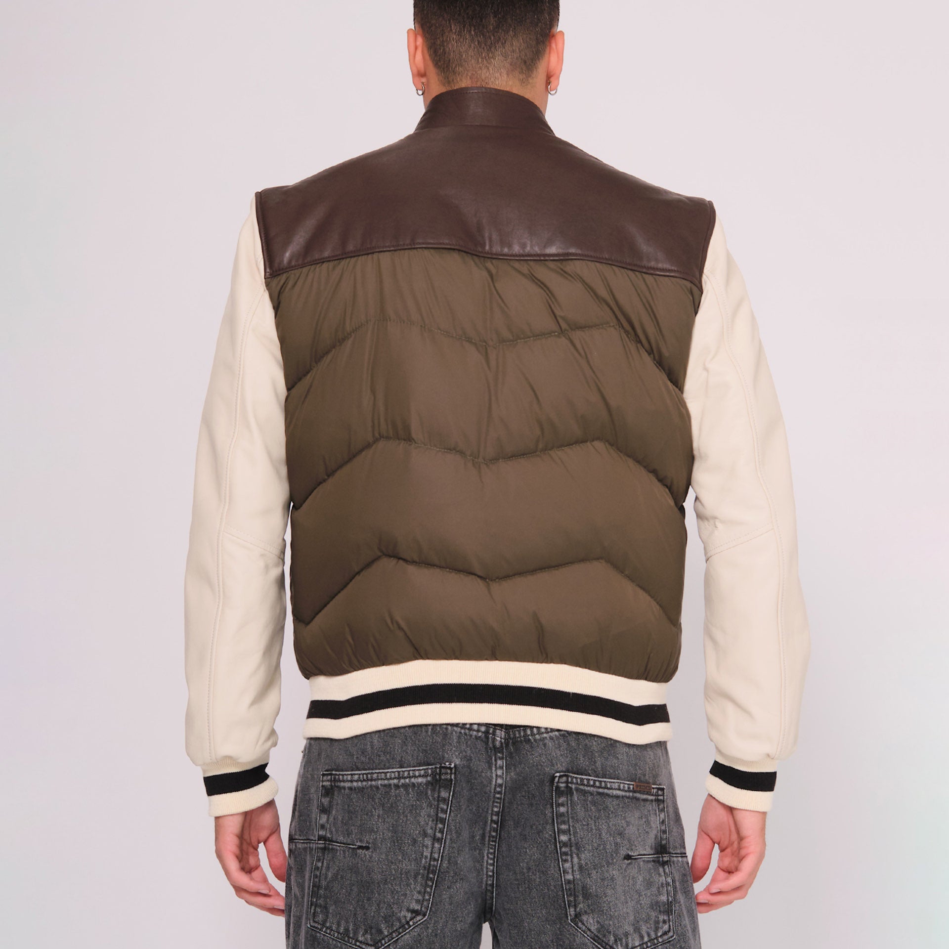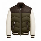 Giacca bomber in pelle e nylon con imbottitura in piuma d'oca