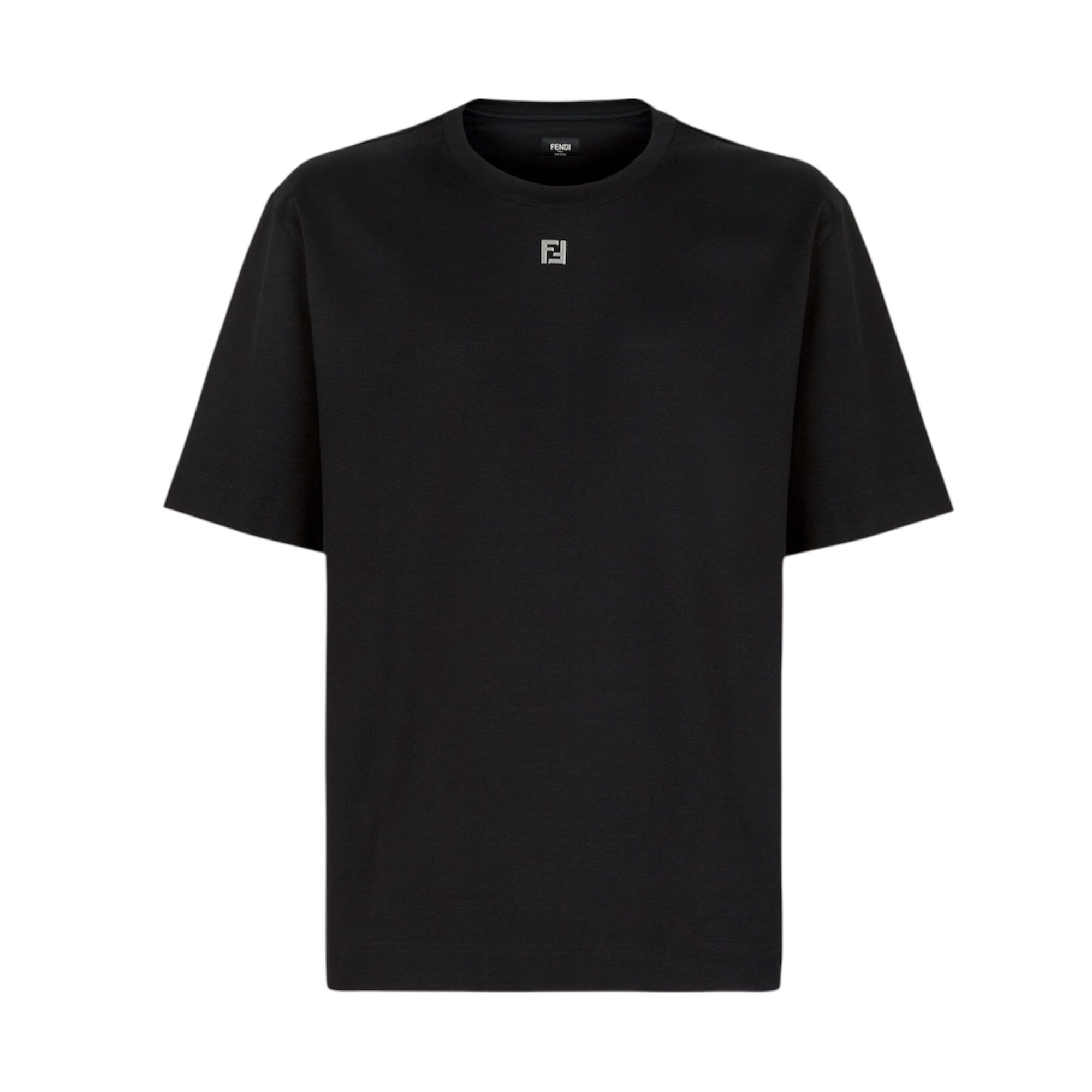 T-shirt nera over fit, con collo a giro e maniche corte. Realizzata in 100% cotone nero. Personalizzata con applicazione FF in metallo sotto il collo