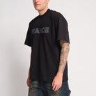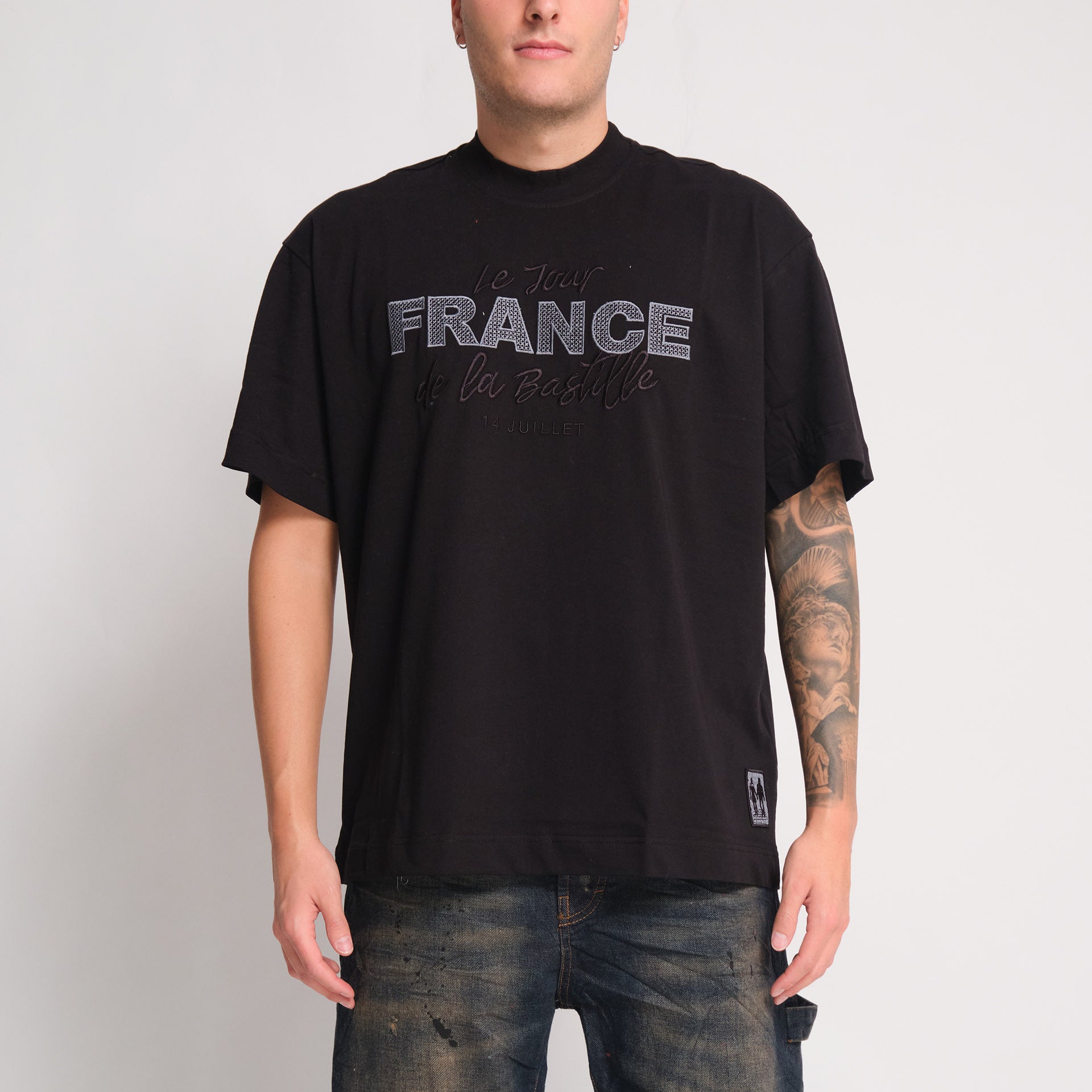 T-shirt nera con scritta in rilievo. Vestibilità comoda