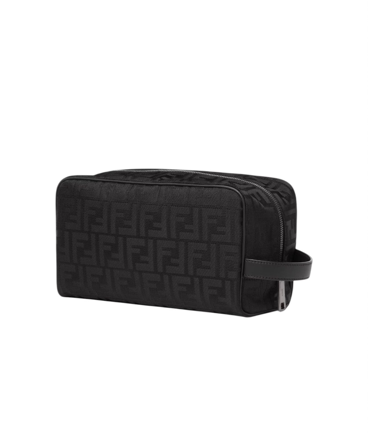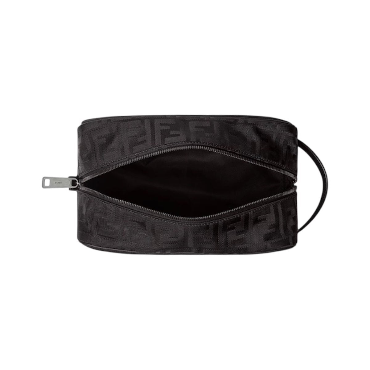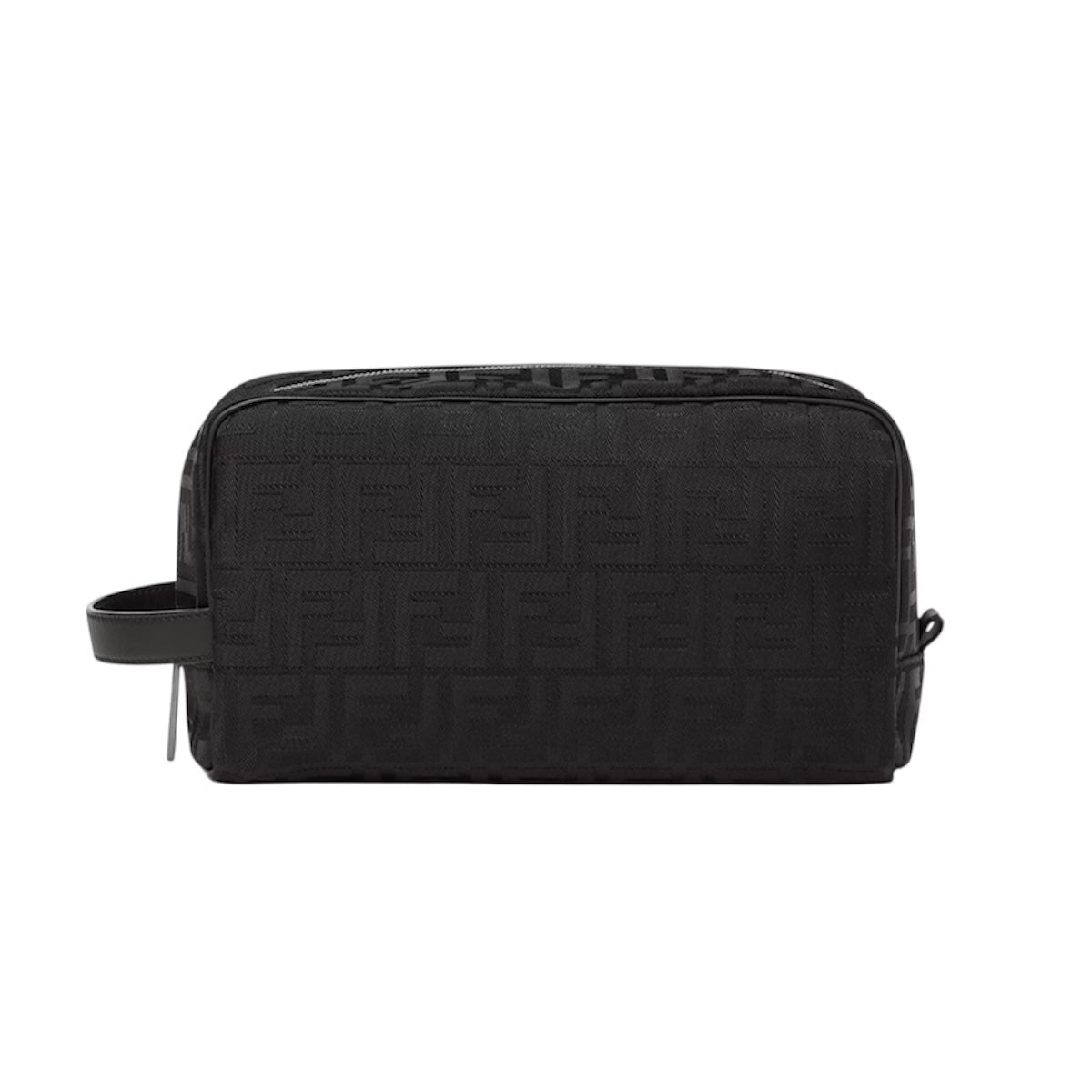 Beauty case misura media con zip. Realizzato in Nylon FF imbottito di colore nero, dalla texture lucente e leggermente a rilievo. Rifinito con manico in pelle di vitello liscia di colore nero. Fodera in tessuto lavabile. Accessori metallici con finitura rutenio satinato.
