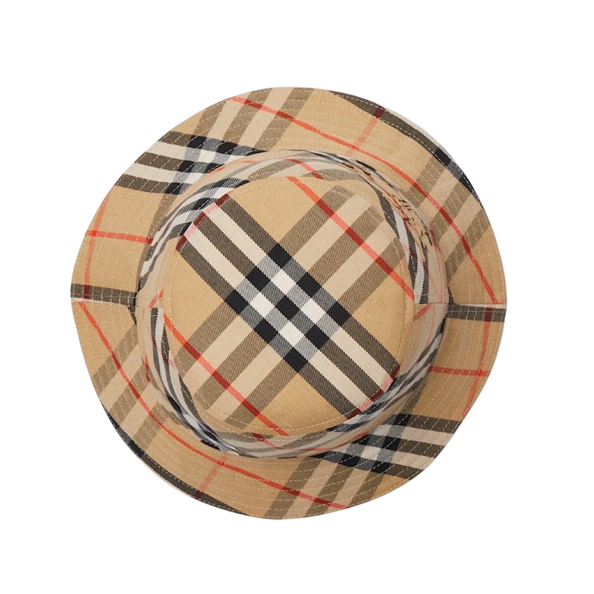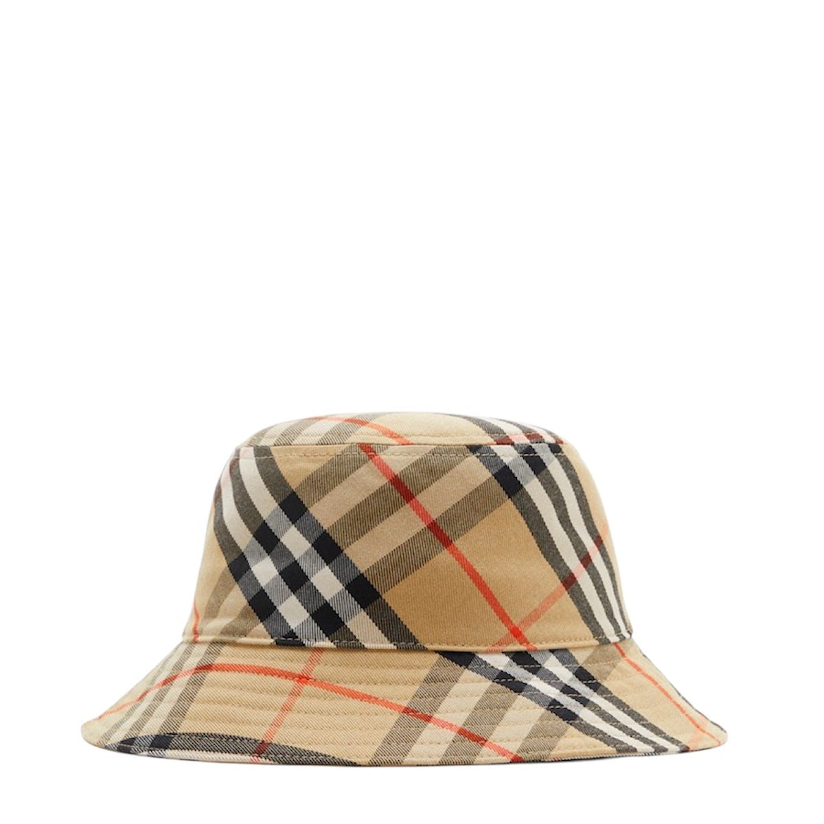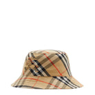 Cappello da pescatore realizzato in Italia in twill intessuto con Burberry Check. Il modello sfoderato è completato da un'applicazione con Equestrian Knight Design.